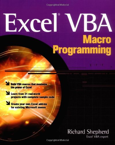 Make Excel work harder and faster for you. This unique book presents sample code for more than twenty practical, high-powered Excel VBA macro applications. You’ll get all the essentials of VBA, and then explore ways to power Excel with VBA. Automate tasks, convert numbers to labels, transpose cells, add formula details, globally changes values, and much, much more.